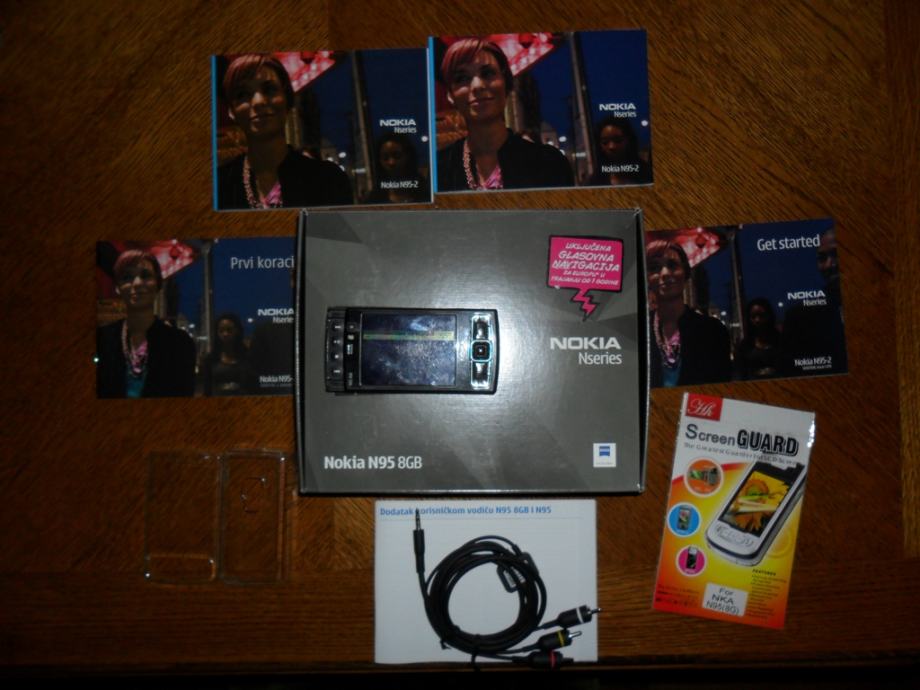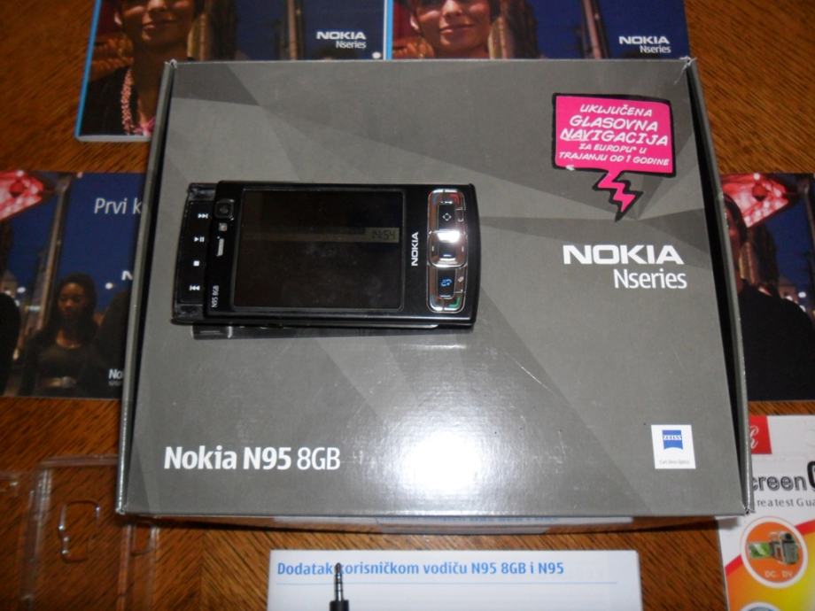 Prodajem Nokiu N95 8GB, kutija, papiri, slusalice, punjac, TV kabel, Crystal Case, Screen Protector. Prednja i bocna strana u savrsenom stanju bez ogrebotina, na zadnjoj strani jedino je malo izlizano po rubovima od nosenja u dzepu. Na mobitelu je zadnji software V 35.0.001. Instalirana zadnja verzija Garmin nacvigacije sa kartama Hrvatske i susjednih zemalja, moguce je staviti i cijelu Europu ili cak Svijet na zahtjev kupca. Uz mobitel osim osnovne opreme dolazi i drzac za postavljanje u auto vrijednosti preko 300 kn.