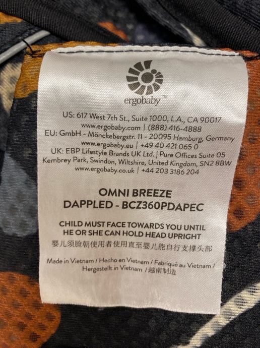 Nosiljka Ergobaby Omni Breeze, u limitiranom izdanju “dappled”. Drugi vlasnik (i u nas i kod prve vlasnice jako malo korištena). Stanje je izvrsno, a nosiljka je iznimno ugodna za nošenje.