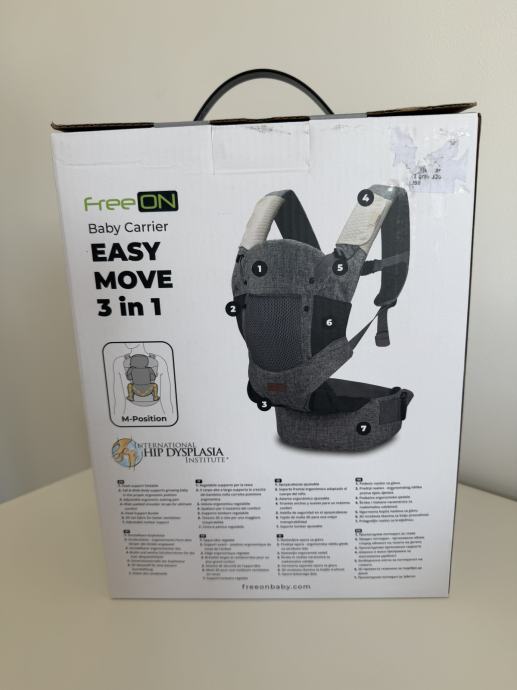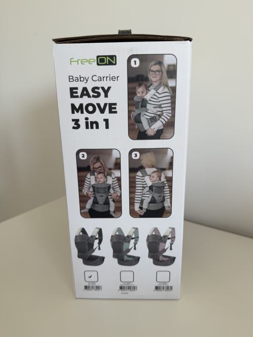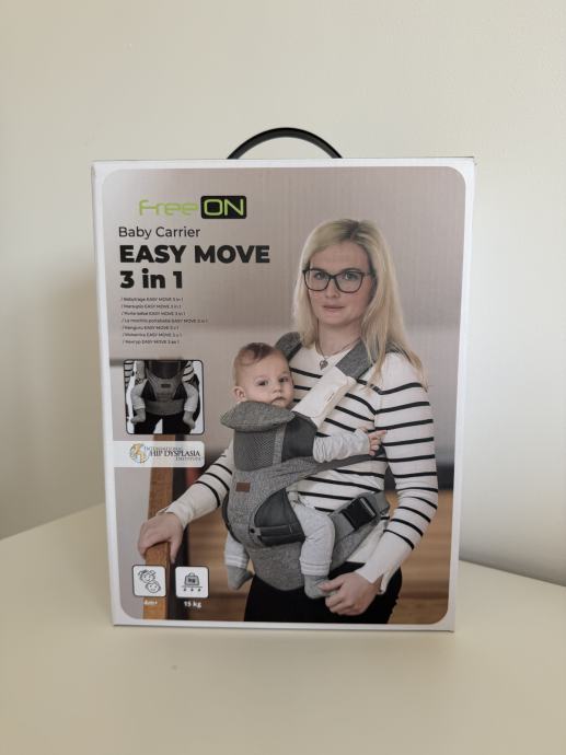 FreeON Easy Move 3 u 1 pogodan je za djecu od 4 mjeseci do 15 kg, a omogućuje pravilan položaj djeteta u cijelosti. Dodatnu udobnost pruža potpora za glavu te ugodan i udoban materijal zbog kojeg nećete imati osjećaj da nosite dijete. Nosiljka FreeON Easy Move 3 u 1 ima dovoljno širok razmak između nogu kako bi noge bile u ispravnom M položaju. Nosiljka FreeON Easy Move 3 u 1 omogućuje vam da bebu nosite u 3 različita položaja. Plaćena 49,99 u BabyCenter. Novo, ne korišteno.