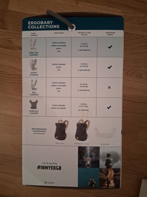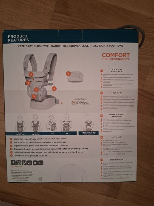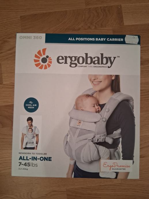 Nosiljka za dijete ergobaby omni 360. Moguća 2 položaja djeteta od naprijed, jedan od iza i jedan bočno. Za djecu od 3,2kg do 20 kg. Ima 2 torbice i kapuljaču.