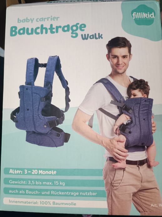 Prodajem dječju nosiljku FILLIKID, samo jednom isprobana tako da je potpuno nova i bez oštećenja, može se nositi na više načina, pogodna za djecu do maksimalno 15 kilograma težine, ispod nosiljke remen koji roditeljima omogućuje lakše nošenje.