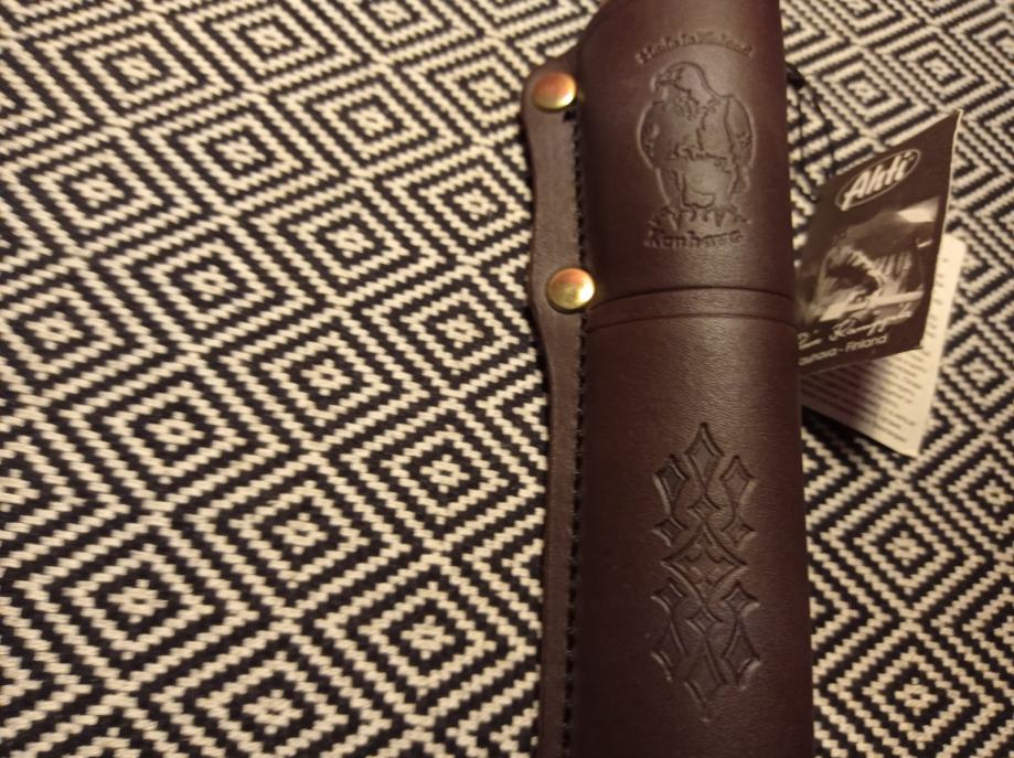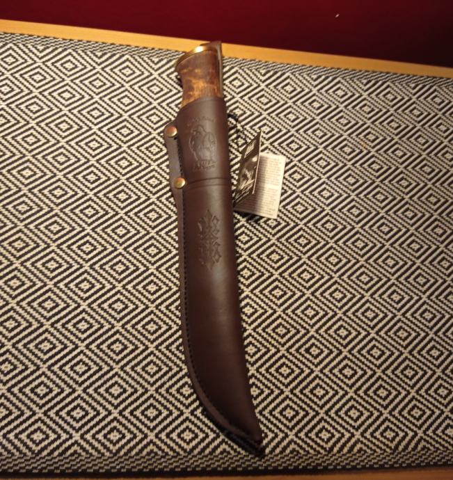 Black spined, razor sharp carbon steel blade comes from Laurin Metalli. Curly birch handle is treated with linseed oil and finished with polished brass bolster. Beautifully decorated, brown leather sheath with plastic insert.