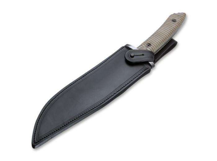 Böker Arbolito El Gigante Micarta fiksni nož je vrlo kvalitetan i atraktivan veliki radni nož, namijenjen radovima u prirodi, taktičkoj primjeni, lovu ili survival aktivnostima. Obloge drške noža su iz zelene micarte, orebrene za siguran hvat. Sječivo je iz vrhunskog N695 čelika, a nož je full tang konstrukcije. Tang noža se sužava prema kraju drške, što je odlika samo vrlo kvalitetnih noževa, a olakšava nož bez umanjenja čvrstoće. Böker Arbolito El Gigante Micarta fiksni nož posjeduje štitnik za prste iz nehrđajućeg čelika, a nož se isporučuje s kvalitetnim kožnim koricama u crnoj boji.