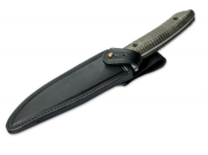 Böker Arbolito Esculta Micarta fiksni nož je sjajan lovački i radni nož, atraktivnog oblika, vrlo kvalitetnih materijala i izrade. Böker Arbolito Esculta Micarta fiksni nož ima sječivo od N695 nehrđajućeg čelika i stonewash fniša, uz Micarta obloge. Nož je full tang konstrukcije, pri čemu se tang sužava prema kraju drške (tzv. tapered tang), što je odlika samo najkvalitetnijih noževa, a daje odličan balans i malu masu. Böker Arbolito Esculta Micarta fiksni nož se isporučuje s kvalitetnim kožnim koricama u crnoj boji.