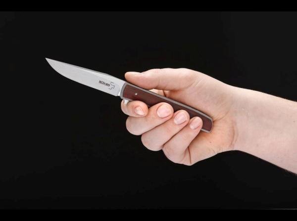 Böker Plus Urban Trapper Cocobolo preklopni nož je vrlo elegantan, profinjenih linija, tzv. džentlmenski nož. Uz vitke linije, tome značajno doprinose i obloge iz Cocobolo drveta, ispod kojih se nalaze titanski lineri. Sječivo je iz japanskog nehrđajućeg VG-10 čelika, a otvaranje je brzo i lako zahvaljujući kugličnim ležajevima i flipper ispustu. Kočnica je framelock tipa. Böker Plus Urban Trapper Cocobolo preklopni nož je opremljen kvačicom za džep (tip-up). Isporučuje se s futrolom.