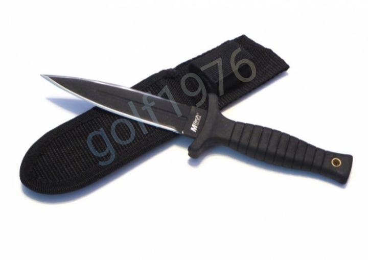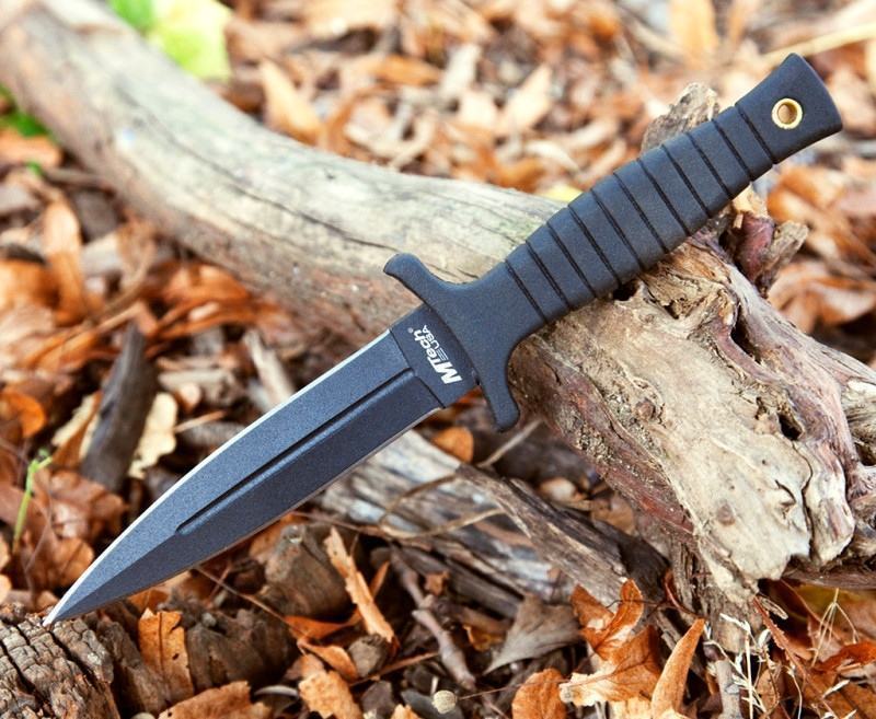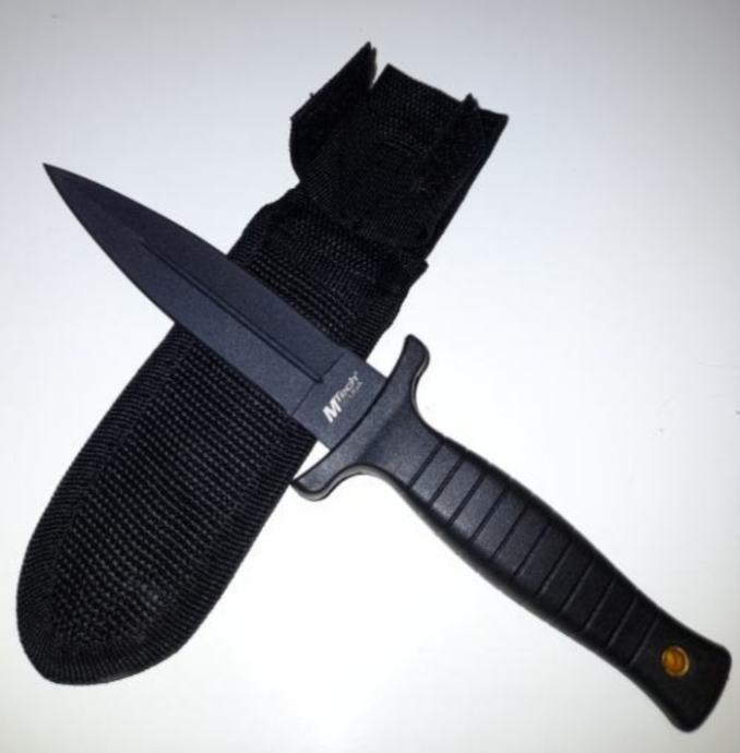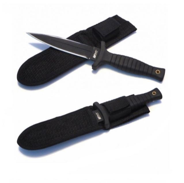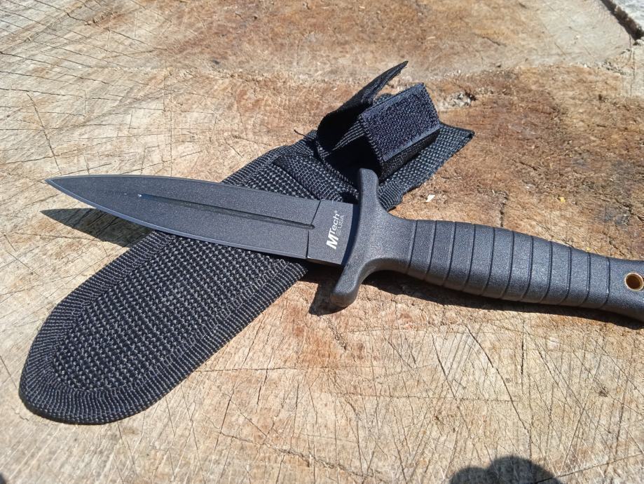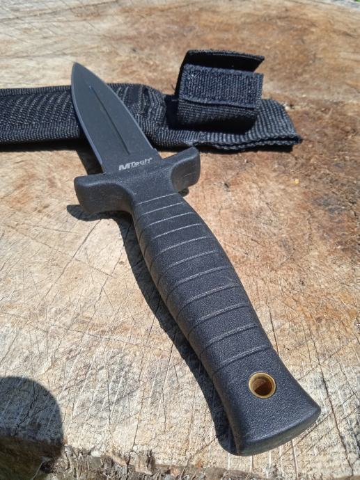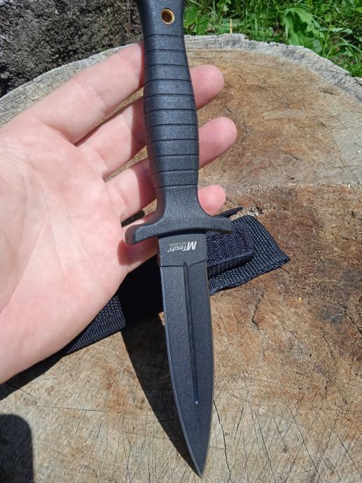 MTech Balck Dagger sa dvostrukom oštricom izrađenom od čelika 440 sa završnim crnim premazom, gumirana ručka od polyamida osigurava čvrsti hvat, drška na sebi ima rupu kroz koju se provuče sigurnosno uže