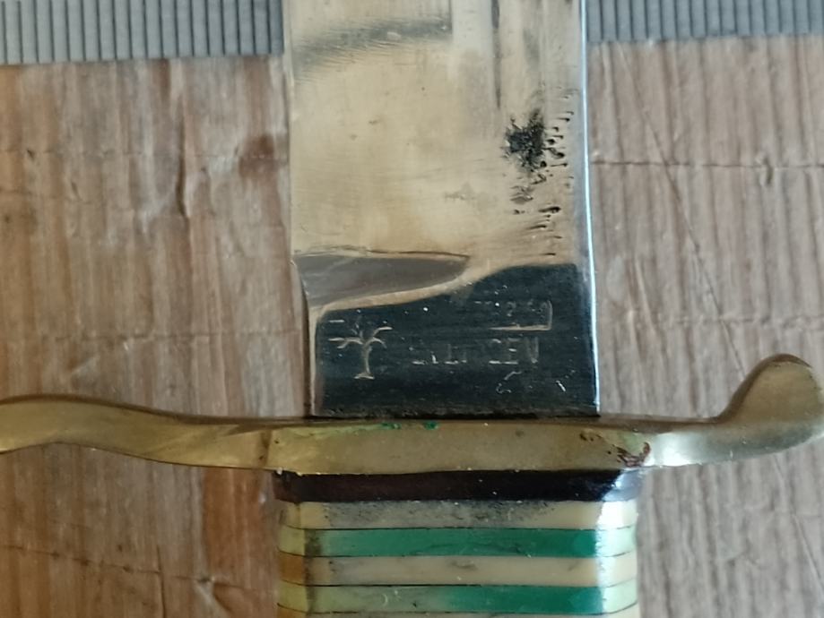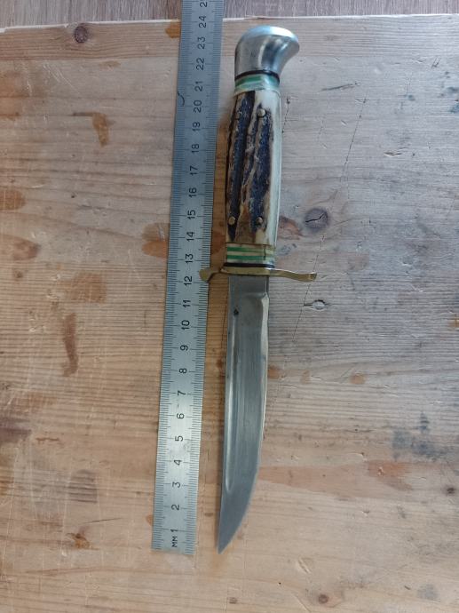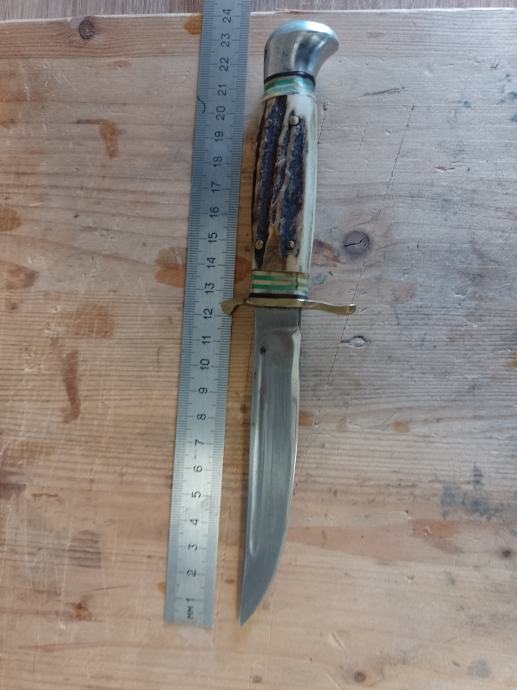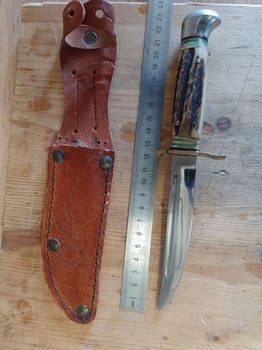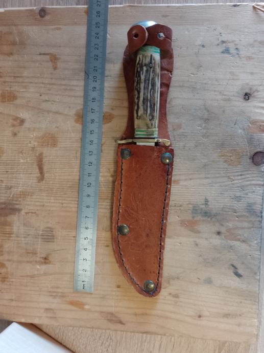 BOKER lovački nož , jako malo korišten , rađen oko 1950 g , sa kožnom futrolom. Oštrica ispravna , rađena od kvalitetnog ugljićnog čelika. Drška jelenski rog učvršćen za mesing zakovicama, bolster mesing .Oštrica 12 cm , ukupna dužina 23 cm . Kvalitetan Njemački lovački nož i za kolekcionare . Iz kolekcije ne koristi se .