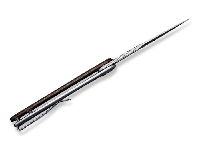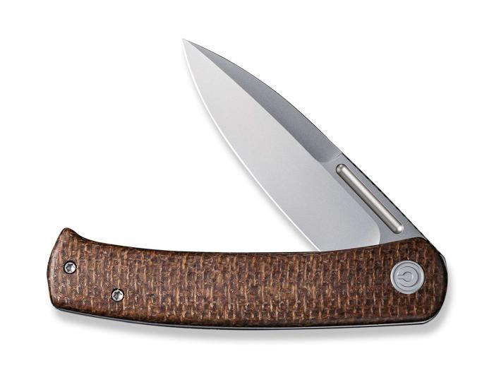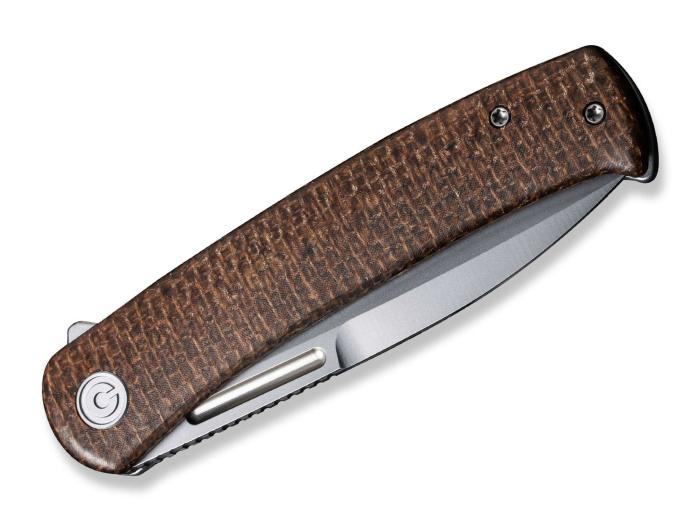 CIVIVI Cetos Micarta Brown preklopni nož objedinjuje jednostavnu eleganciju i visoku praktičnost. Sječivo je spearpoint oblika, izrađeno iz 14C28N čelika, s pjeskarenim finišem. Otvaranje je pomoću flipper trna ili ureza za nokat. Kočnica je framelock tipa, iz nehrđajućeg čelika. Obloga drške je iz smeđe micarte. CIVIVI Cetos Micarta Brown preklopni nož je opremljen kvačicom za džep.
