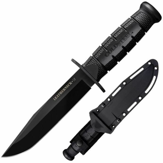 Cold Steel Leatherneck noževi dolaze u dva, vrlo poznata i provjerena oblika sječiva: SF ima clip point vrh sječiva i sabre grind profil, dok Tanto dolazi u dobro poznatom Cold Steel American Tanto obliku. Materijal sječiva je D2, a sječivo je puni tang (proteže se do kraja drške). Štitnik za prste je iz čelika. Drška je iz orebrenog Kray-Ex materijala. Na samom kraju drške nalazi se metalna kapica, za razliku od plastičnih završetaka kod drugih proizvođača. Korice su od provjerenog Secure-Ex materijala.