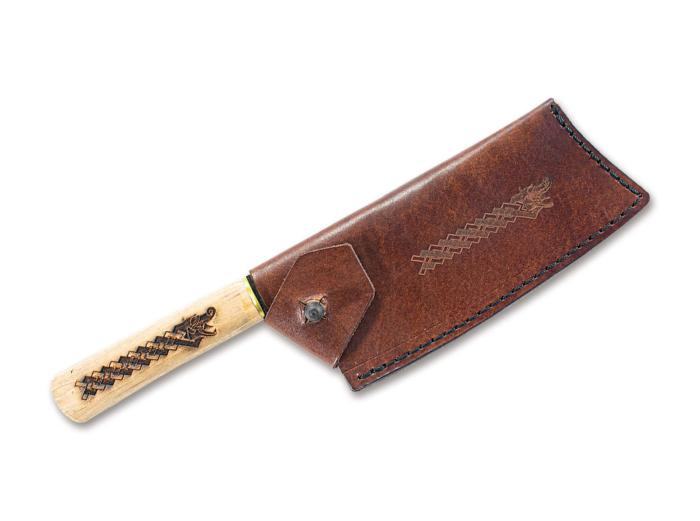 Posebnu pažnju privlači motiv zmajeve glave utisnut u dršku tehnikom spaljivanja, uz nordijske umetke koji se vizualno nastavljaju duž cijelog noža. Prednji dio oštrice s karakterističnom izbočinom i urezom nalik nosnici dodatno pojačava dojam zmajevske siluete. Nadahnut vikinškim duhom, ovaj izniman nož dolazi s kvalitetnom kožnom futrolom.