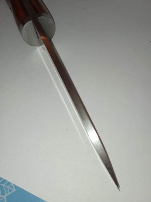 Fino naoštrena oštrica je izrađena od nehrđajućeg čelika visoke tvrdoće (58 HRC) široka u najširem djelu 3cm a debljine 4mm.