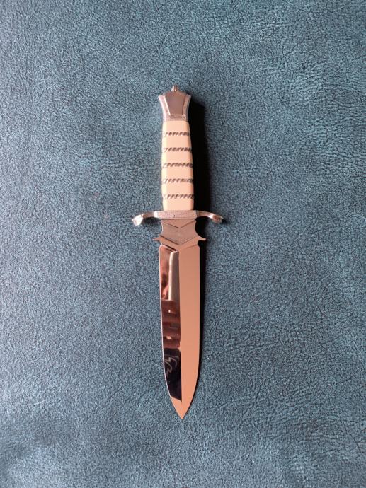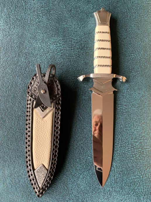 Lovački bodež GB Blades ručno kovan, u prezentacijskoj kutiji prodajem iskusnom poznavatelju.Čelik RWL 34, Nikl silver drška od kosti boje Yuma ivory .
