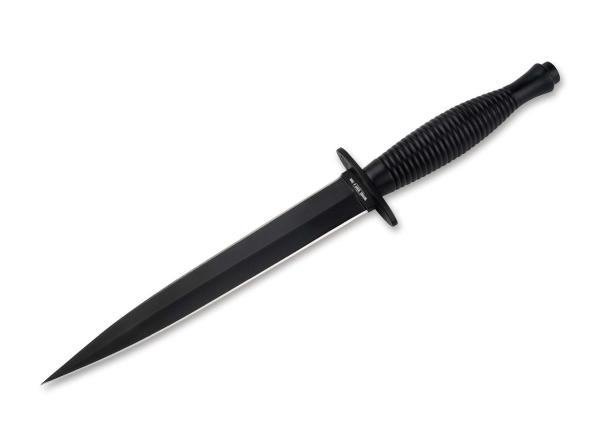 The History Kife & Tool Commando Dagger is a realisation of the famous Fairbairn-Sykes Fighting Knife, which is quite rightly referred to in specialist literature as the mother of all modern fighting knives. The F-S Fighting Knife was designed by the two close-combat legends, Lieutenant-Colonel William Ewart Fairbairn and Major Eric Anthony Sykes, during their service with the Shanghai Municipal Police (SMP). The first batch of 50 was produced by Wilkinson Sword Ltd. in Sheffield in 1941, after Fairbairn and Sykes had presented their ideas for an optimal combat knife there. The knife was first used by Allied commands such as the SOE, the SAS and the OSS. In the course of the Second World War, it was increasingly issued to regular units and subsequently adopted by special forces of various nations. Today it is a symbolic part of the insignia of numerous paratroops and special combat units. It was produced worldwide by various manufacturers without a uniform and binding pattern for the F-S. The current form corresponds to the 3rd pattern, which was produced from 1943 onwards and for which a uniform specification was not laid down until 1949 with the UK government specification E/1323E. NATO lists the F-S knives according to this specification under the supply no. 1095 99 963 2037. Our model follows this 3rd version, which is classic in every respect. The specification includes the following features: A narrow double-edged medium pointed blade of 18 cm length, an oval yet straight guard, the characteristic jimpings on the spindle handle of aluminium with a through-going tang and the complete blackening of all the parts of the knife. The dark brown leather sheath has a blackened and studded patch plate, a belt loop fastened with two studs with a simple, yet effective 20 mm wide rubber strap to secure the handle, and two leather straps for optional sewing on or sewing into a uniform. Tough 420 nehrđajući čelik was chosen for the blade.