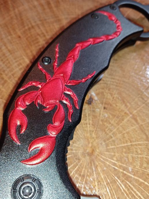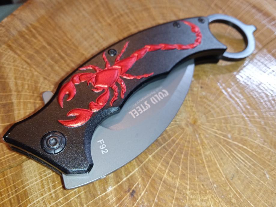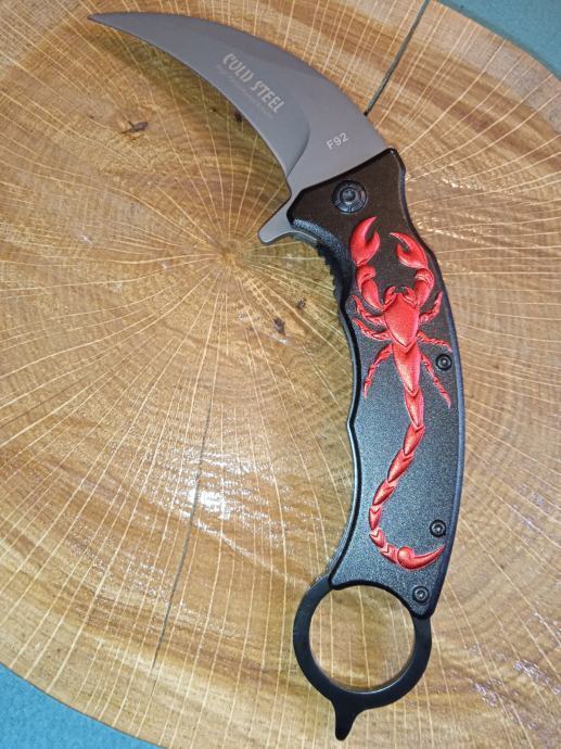 Scorpion F92 Black je veliki karambit nož klasične Hawkbill oštrice ukupne duljine u rastvorenom položaju od čak 21 cm. Oštrica duljine 9 centimetara izrađena je od nehrđajučeg čelika 5Cr15Mov, tvrdoće 57HRC.