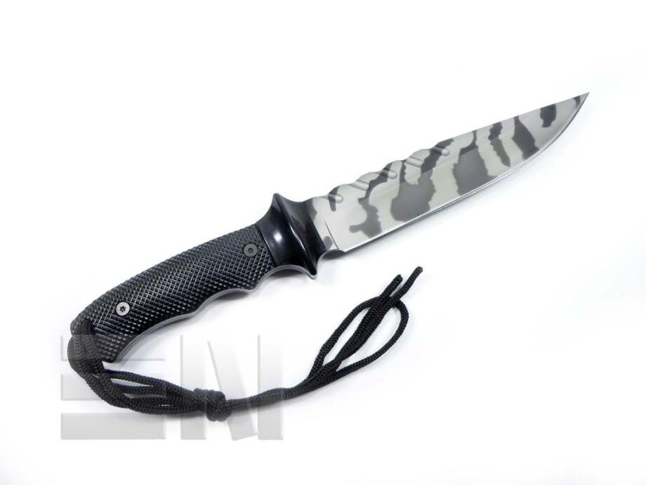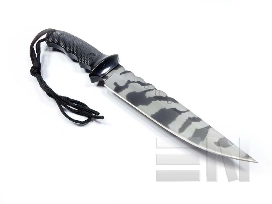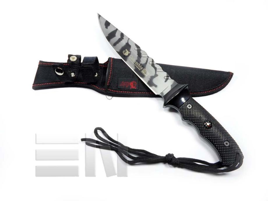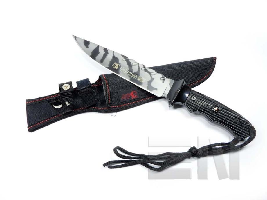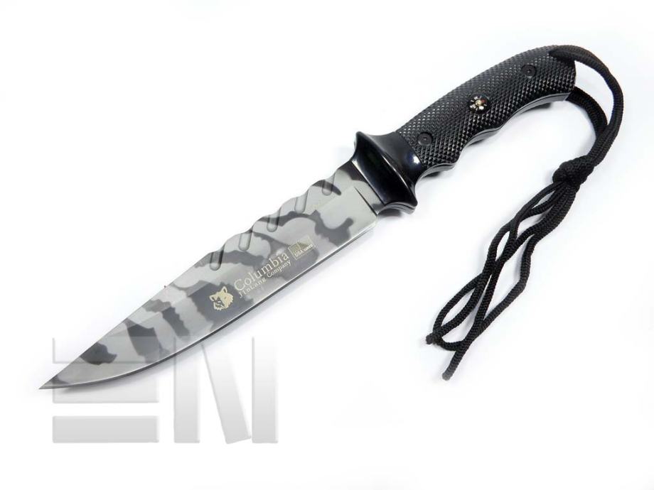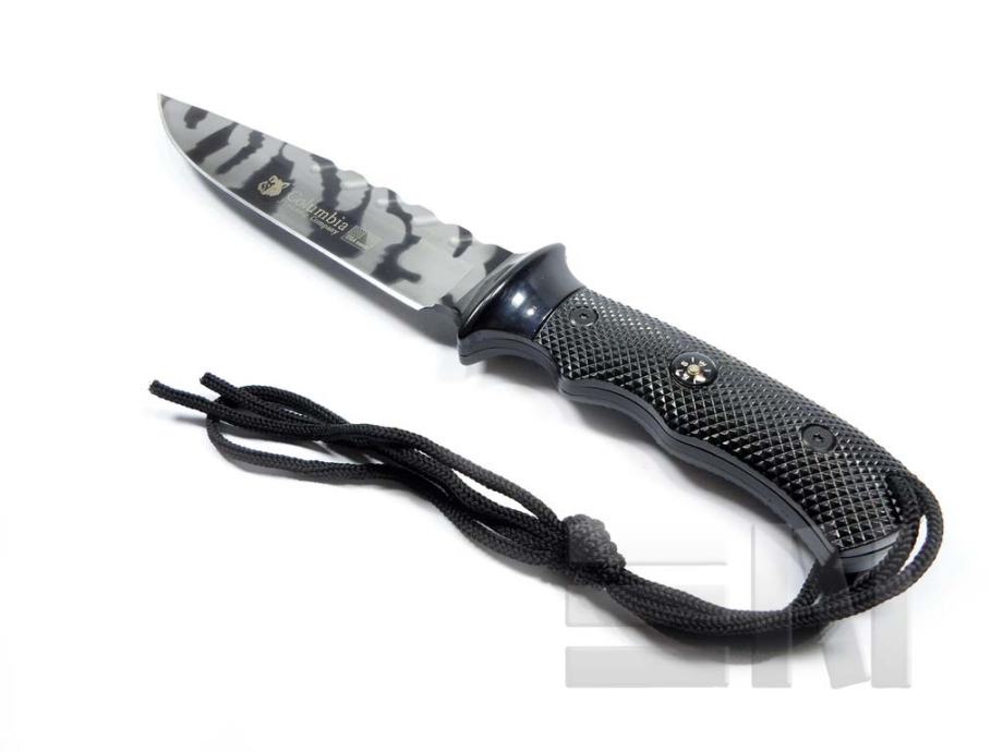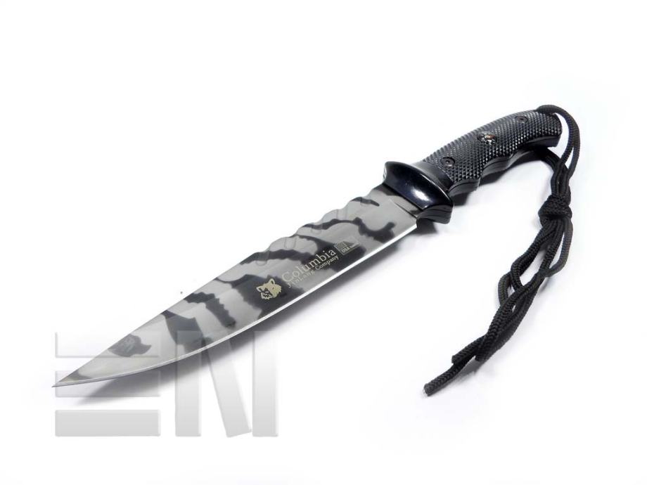 Fiksni Lovački nož COLUMBIA SA26 ukupne dužine 32cm, 18,5cm x 4mm oštrica od nehrđajućeg čelika 3Cr13 s maskirnom završnom obradom., nož ima fiksnu oštricu / fultang / 13cm izdržljiva ABS ergonomska, reljefna, protuklizna drška, omogućuje dobar prihvat, sigurnosno uže - u zaštitnoj crnoj najlonskoj futroli.