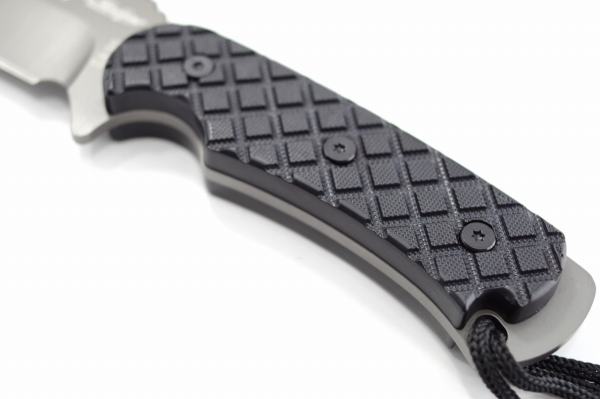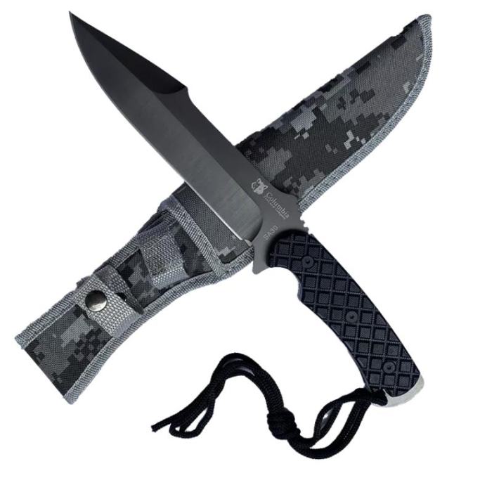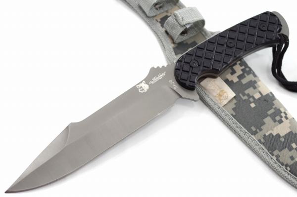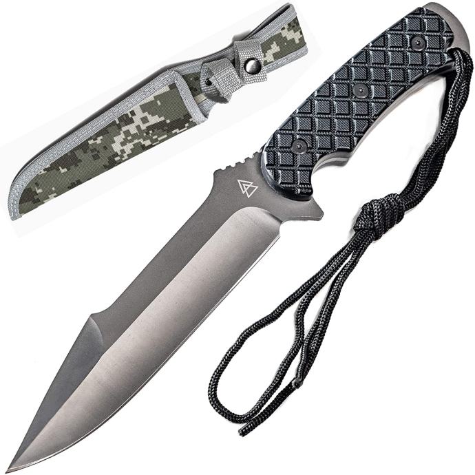 s visokim udjelom ugljika debljine 4 mm, dovoljno jaka da izdrži grubu upotrebu. Jednodijelni dizajn oštrice (Full Tang) po cijeloj dršci osigurava dobar balans oštrice, 13cm protuklizna ABS ručka sa rombastim urezima za čvršći hvat u zaštitnoj camouflage futroli s omčom za remen za laku prenosivost.