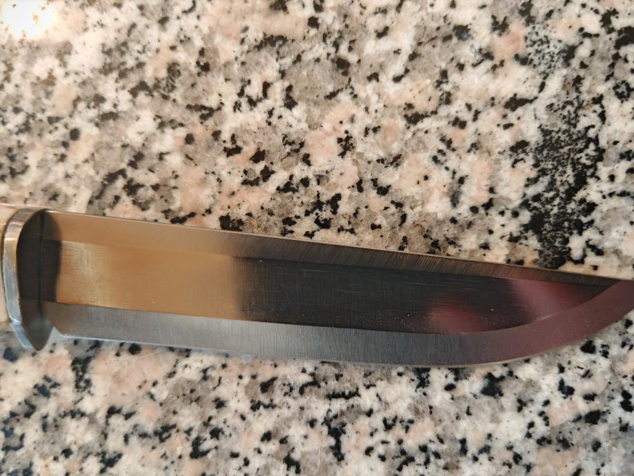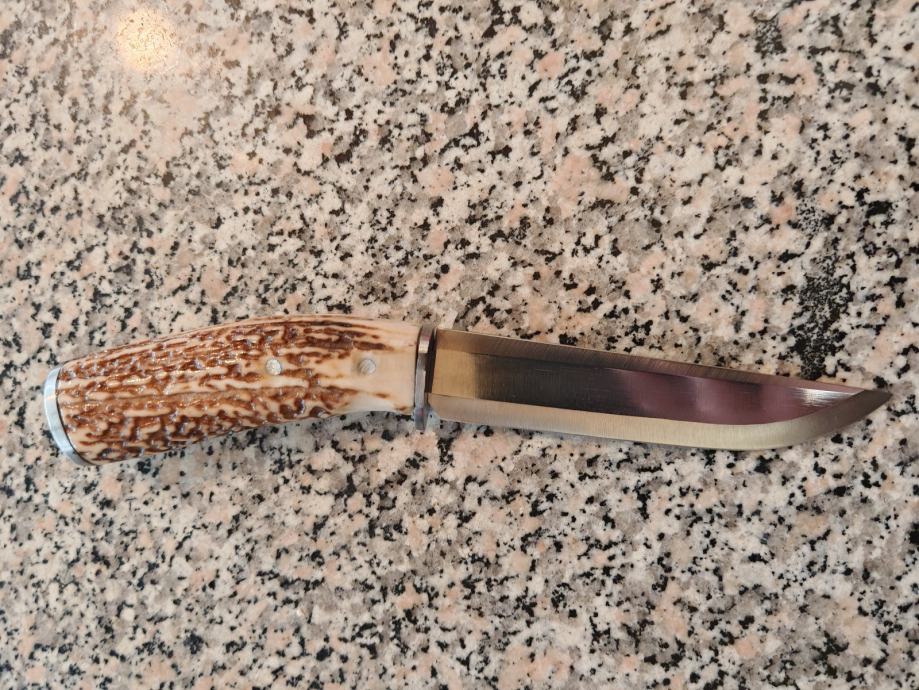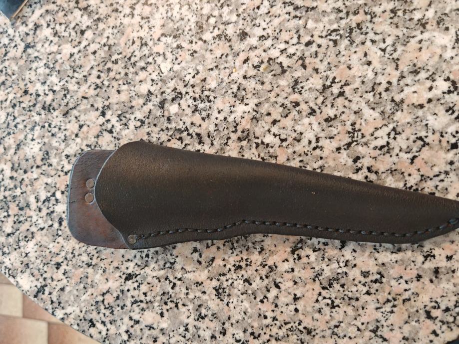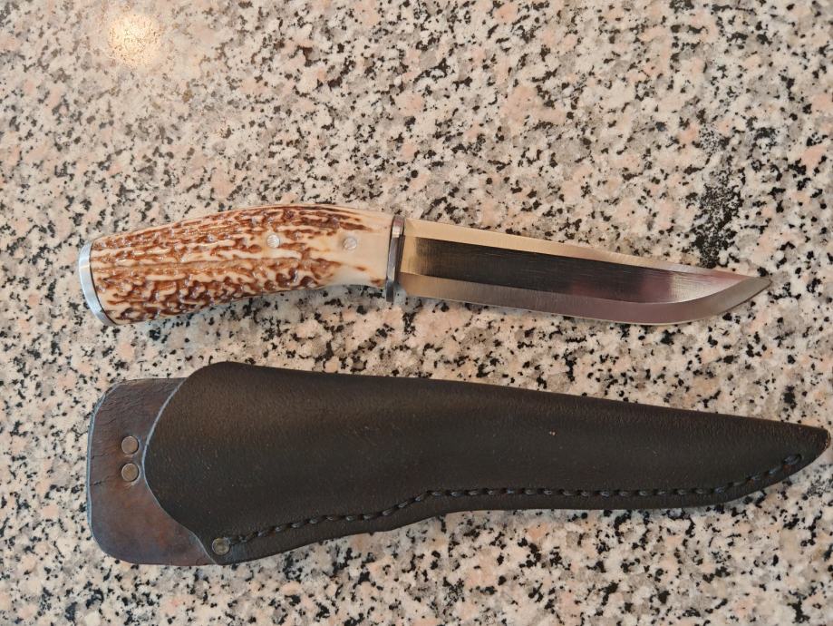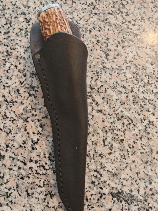 Lovački nož ručni rad.. Ručka od roga i kovano sječište oštar kao britva izuzetno lijepo napravljen.. Futrola također ručni rad prava koža šivano ručno.. Svaki nož je unikat... Dužina noža 30 cm..
