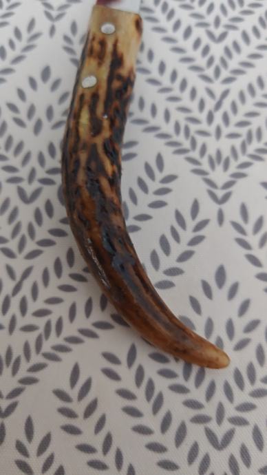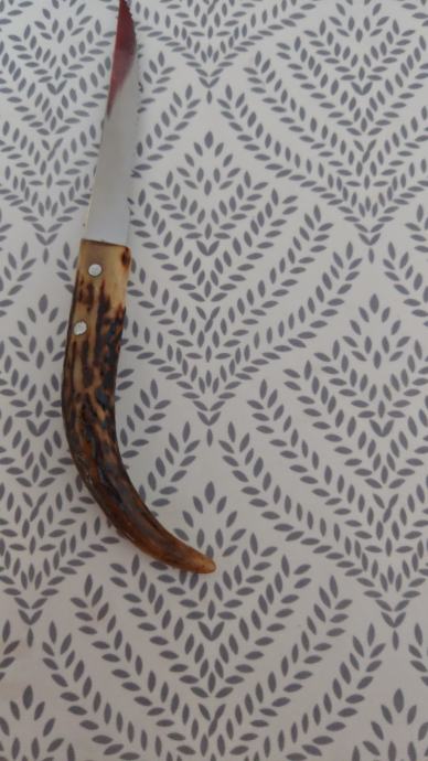 Mali lovački nož ručka ručni rad od roga divljači dužina 21 cm. Sječivo rebrasto.. Ide bez futrole