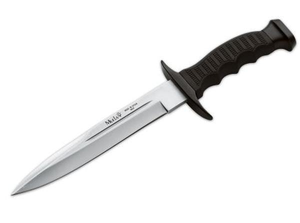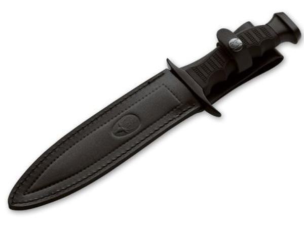Zamak handle with coating of plastic elastomer, blade made of stainless chrome steel (I-42). Sheath made of black laminated leather.