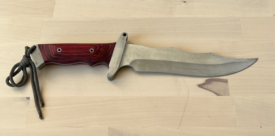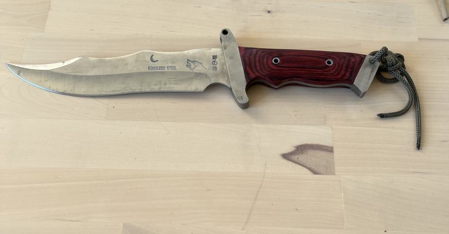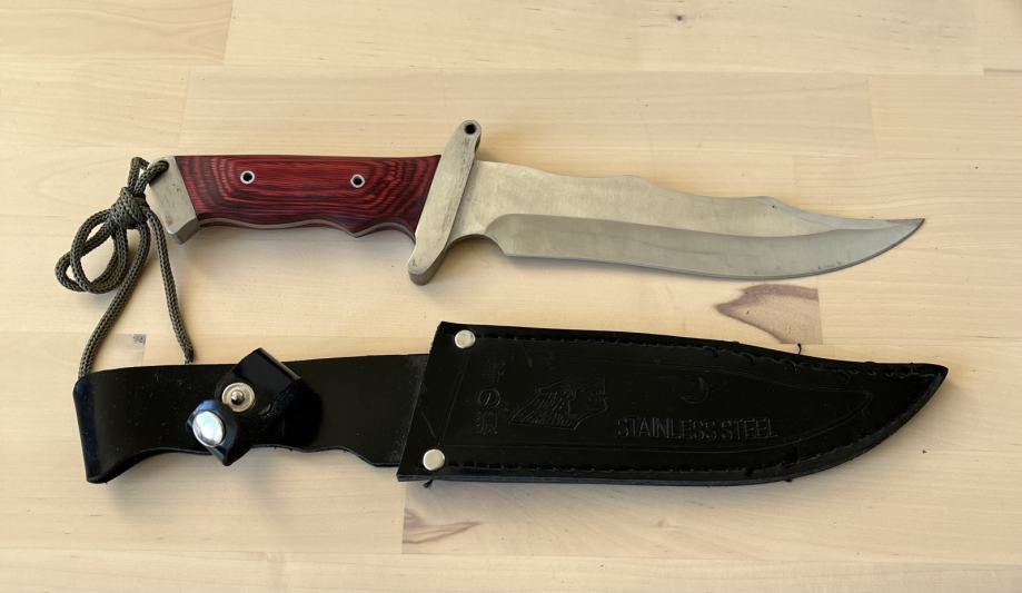 Izrađen od čelika, drvena drška, kožna futrola.
