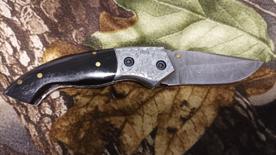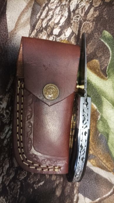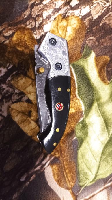 Drška je od obojene bizonove kosti sa lijepim mosaic pinsom i celicnim graviranim bolstetom.
