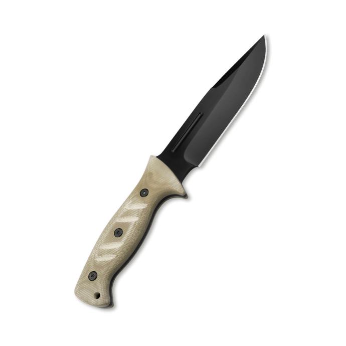 Nož Desert Warrior 2.0 je idealan suputnik za svaku misiju. Taktički nož s Full tang oštricom izrađenom od 440A čelika i crnim premazom. Obloge drške pričvršćene vijcima su izrađene od Micarta-e s uzorkom. Ergonomska ručka sa širokim urezima omogućava sigurno držanje čak i u lošim vremenskim uvjetima. Drška ima zareze na prihvatu palcem kako bi još više poboljšala sigurnost rada s nožem. Na dršci se nalazi i rupa za uzicu. Nož dolazi s najlonskim koricama s privezima za nogu.