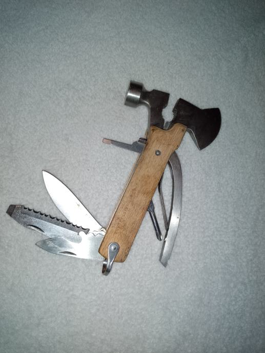 ...višenamjenski. odlično za prvu ruku u prorodi. Nož, šarafciger, pila,čekić, sjekirica, kliješta.... stanje na slikama. 15 cm.