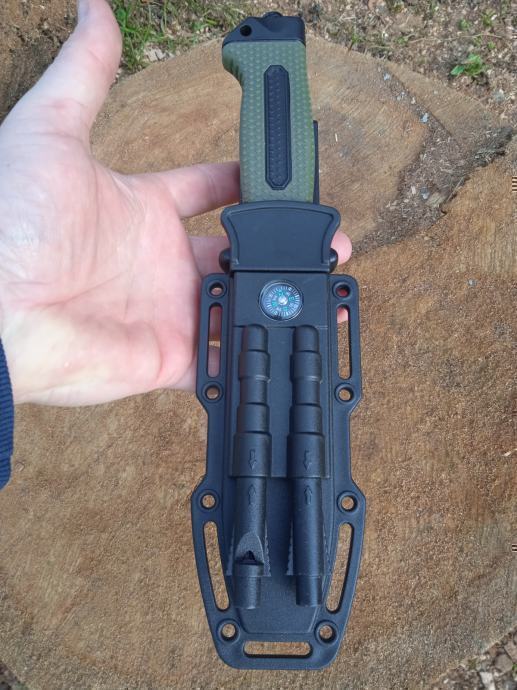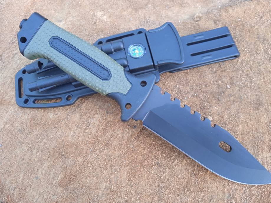 Nož za preživljavanje praktičan, svestrani survival nož s oštricom od nehrđajućeg čelika nezaobilazan je za sve aktivnosti u prirodi, kampiranju, kampiranju, u planini ili na moru. Odličan izbor za kampere, izviđače i sve one koji vode aktivan stil života. Svestrana oštrica reže žicu, meso, drvo i razne druge materijale, a drška je ergonomski dizajnirana za bolji zahvat i veću udobnost. Nož dolazi u ABS futroli sa 5 pribora za hitne slučajeve: zviždaljka, oštrilo, razbijač stakla, upaljač i kompas