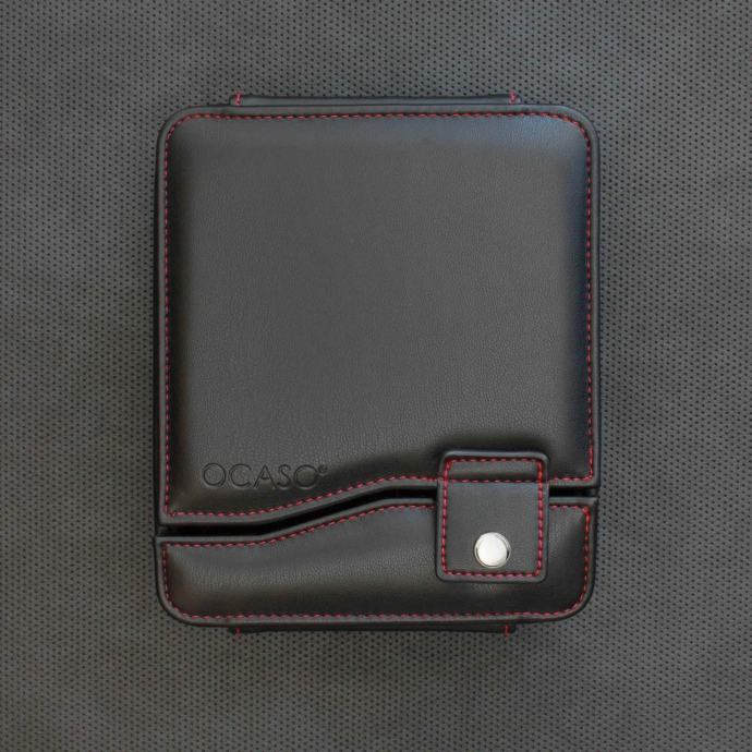 Sadrži vanjski dio od meke crne umjetne kože s crvenim šavovima, srebrne zakovice i mekanu unutrašnjost s prepoznatljivim Ocaso logom u kontrastnom crvenom printu.