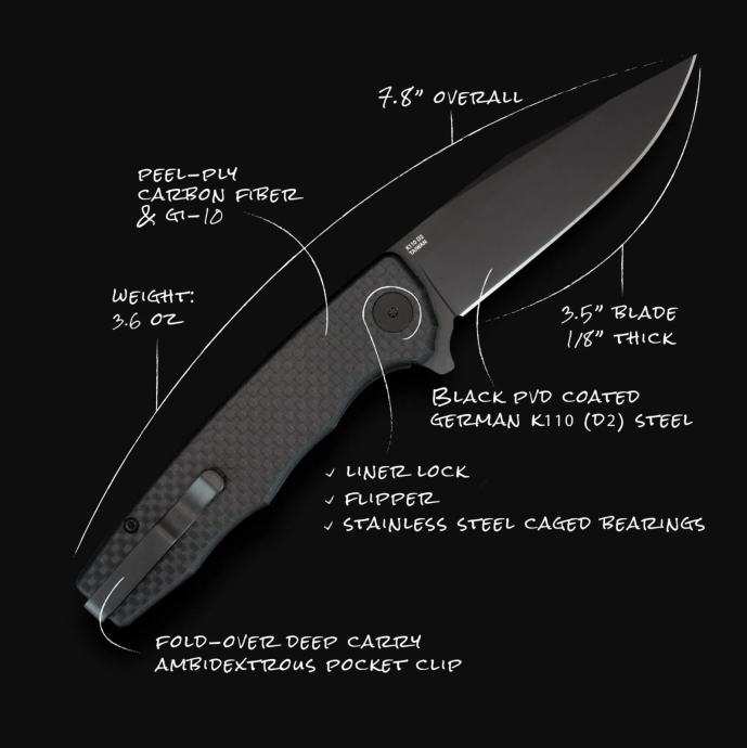 Ručka je dizajnirana za udobnost i izrađena je od Peel Ply Carbon Fiber / G-10 materijala – upletena karbonska vlakna laminirana na G-10 zbog izdržljivosti i male težine.