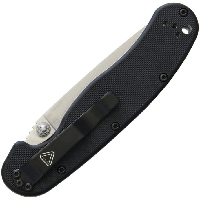 Oštrica debljine 2 mm izrađena od čelika D2 prekrivena je premazom protiv hrđe i reflektirajućim premazom, opremljena je žljebovima za prste na vrhu i otvara se palcem.