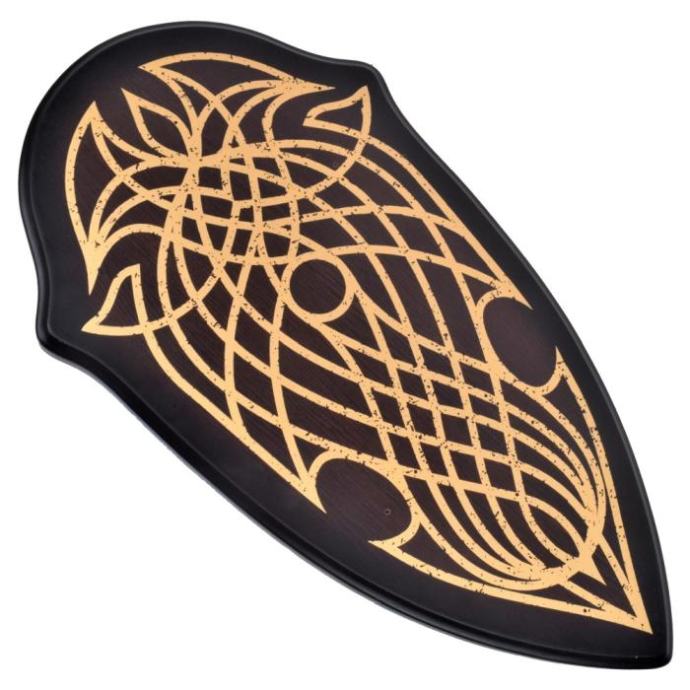 OS Aragornov nož. Čelična oštrica s ukrasima. Drvene korice s imitacijom kože. Drveno postolje u kompletu.