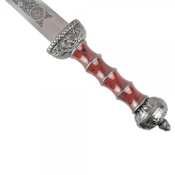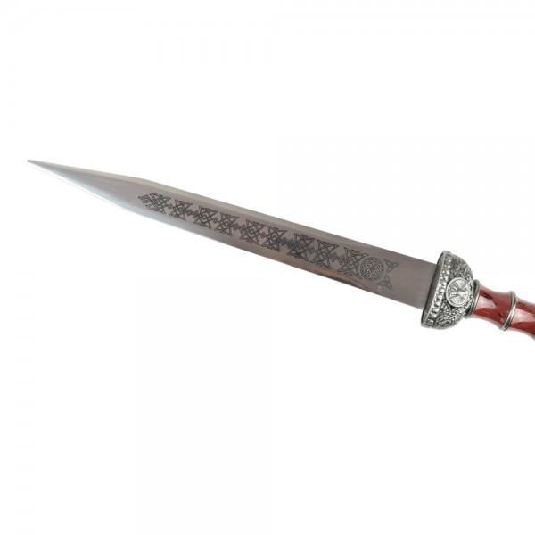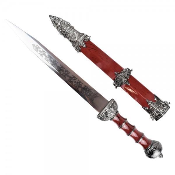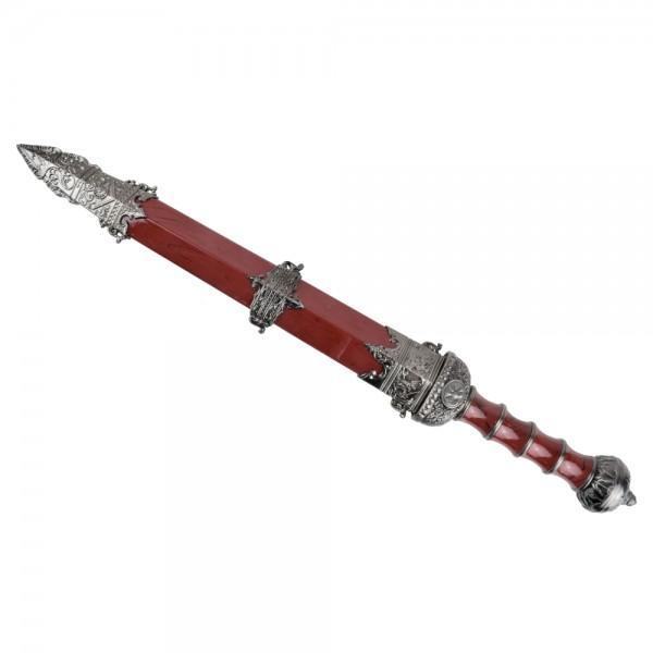 OS rimski bodež. Čelična oštrica. Plastični i metalni štitnik, drška i korice. Duljina oštrice: 280mm. Ukupna duljina: 430mm (465mm s koricama). Bodež je ukrasne prirode, nije naoštren i služi u dekorativne svrhe.