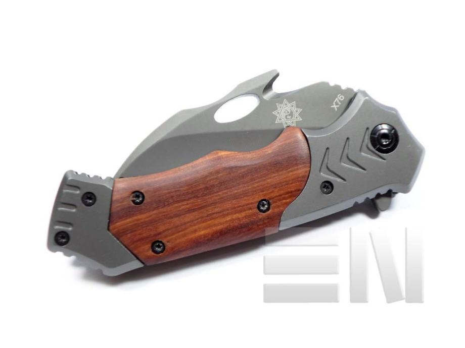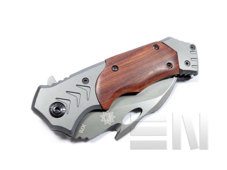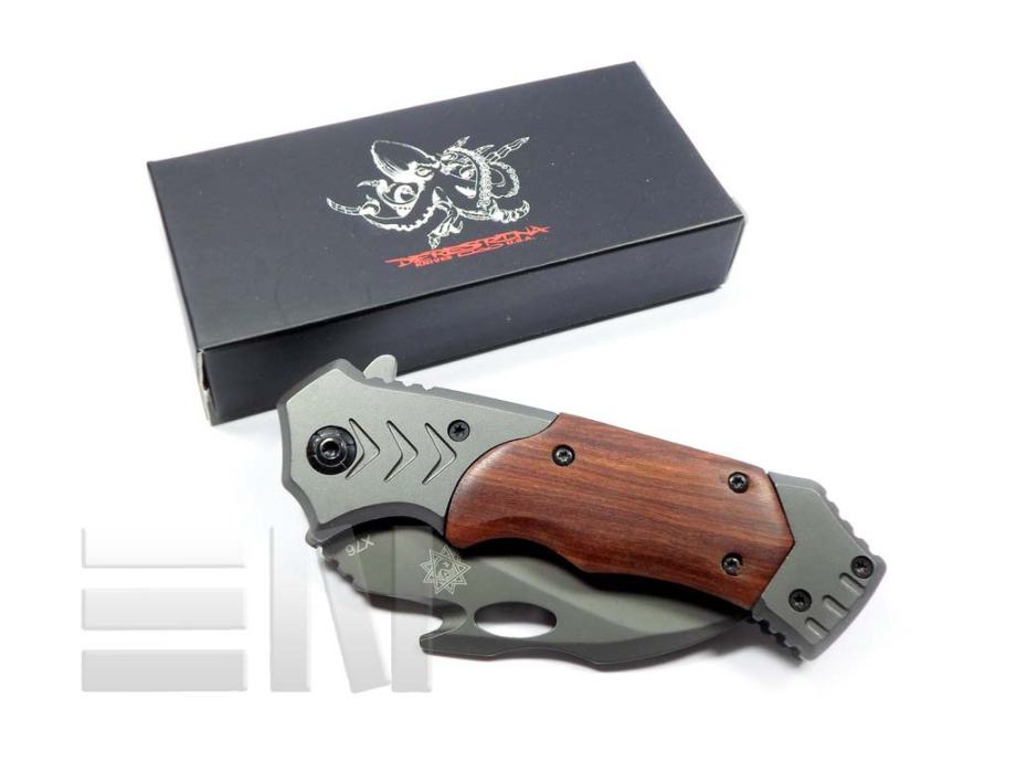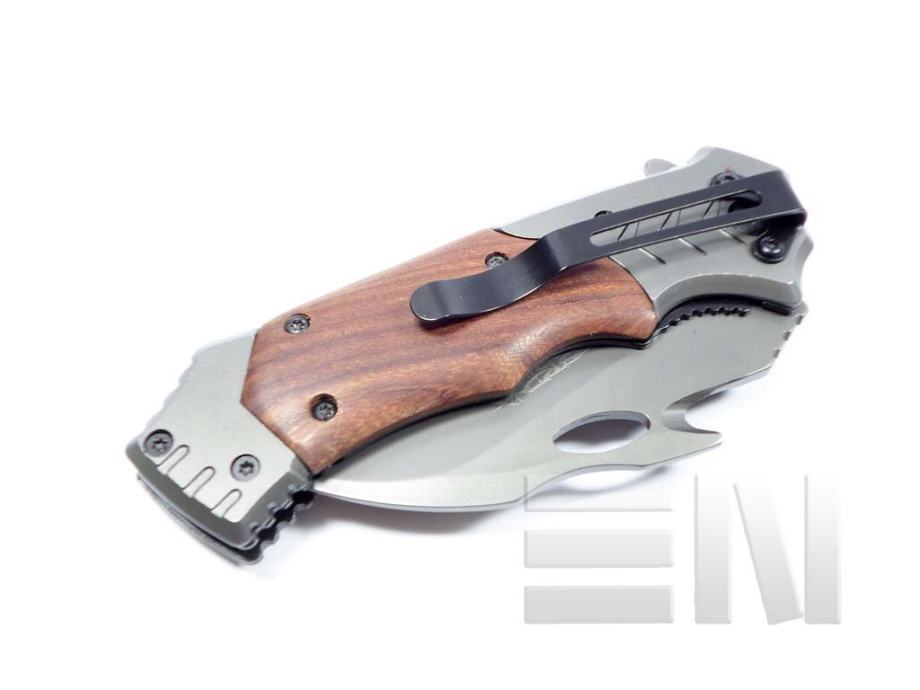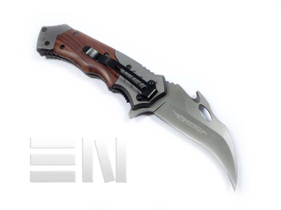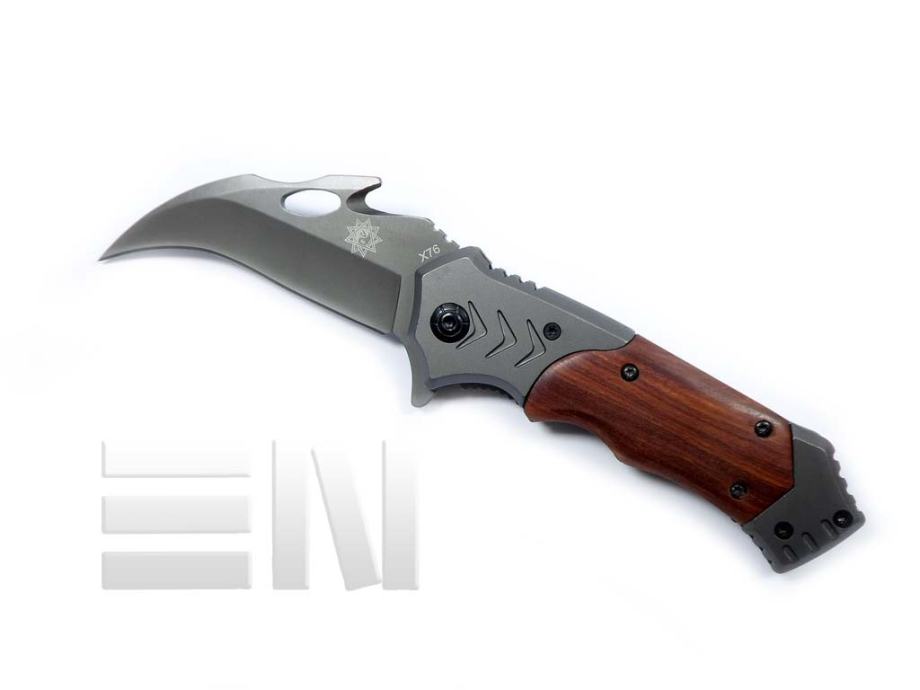 Ovaj prekrasan, kvalitetan karambit nož naći će mjesto u kolekciji svakog kolekcionara noževa i zaljubljenika u egzotične oštrice. Oštrica noža izrađena od nehrđajučeg čelika sa završnim titanijskim slojem, druga oštrica na vrhu sječiva služi za presijecanje špage dok je nož zatvoren. Drška ovog noža izrađena je isto od čelika a s obje strane je presvučena slojem lijepog egzotičnog drveta. Nož ima i čvrstu metalnu zakačku za zakačiti na hlaće, remen ili džep.