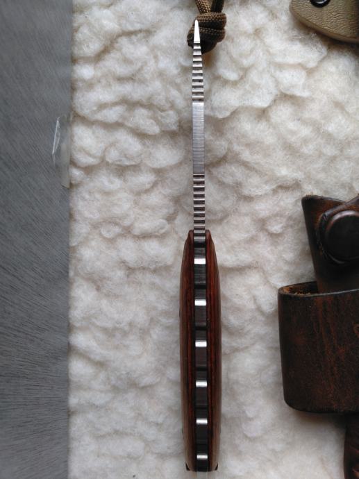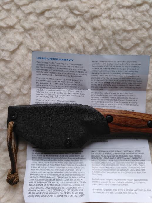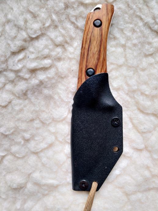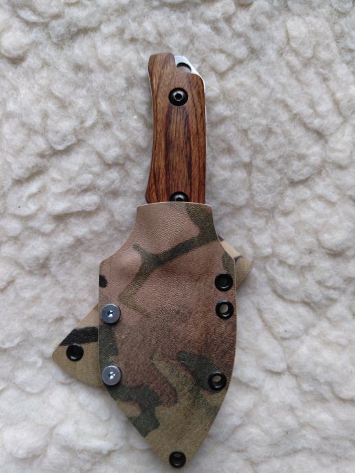 Ergonomska obloga rukohvata od Dymondwood® drveta pruža siguran hvat u svim uvjetima rada. Nož dolazi sa koricama od prirodne kože te 2 dodatne kydex futrole koje su također u cijeni.