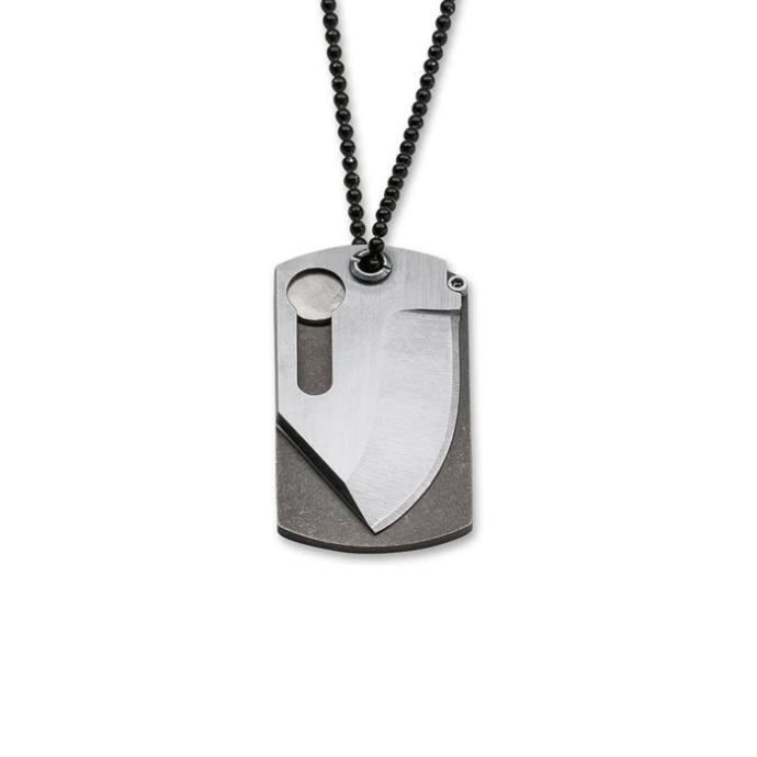 John Kubasek je dizajner noževa najpoznatiji po svom uspješnom Credit Card Knife modelu, a ovaj put vam predstavljamo njegov lagani, praktični i iznimno atraktivan model Dog Tag Knife. Ovaj 24 g težak rasklopni nož se nosi oko vrata na priloženom lančiću. Jednostrani rub oštrice napravljene od 440C čelika osigurava vrhunsku sigurnost pri nošenju i korištenju. Praktičan i inovativan magnetski mehanizam osigurava ovaj Dog Tag nož u rasklopljenom i skopljenom položaju te dodatno štiti uz postojeći, titanijski linerlock mehanizam.