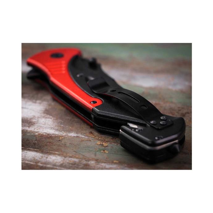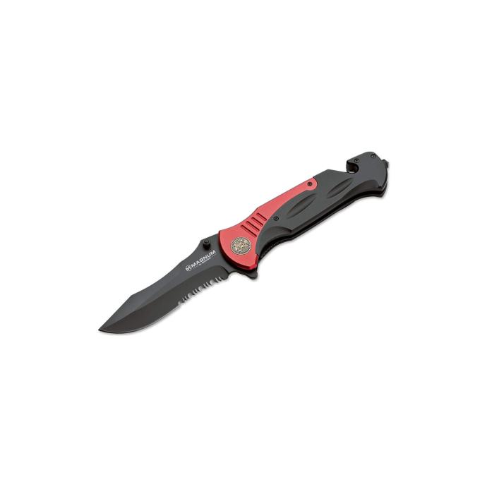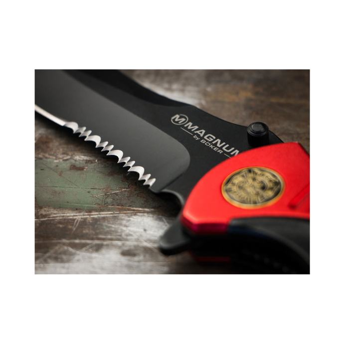 Rasklopni nož Magnum Fire Chief je masivan i impresivan nož za spašavanje. Upadljiva naglašena kombinacija crnih i crvenih boja odražava svrhu i naziv ovog noža. Dizajniran je kao alat za hitne slučajeve s razbijačem stakla, rezačem remena i djelomično nazubljenom oštricom. Stabilan linerlock osigurava potrebnu stabilnost. Zlatni amblem koji je ugrađen u dršku posvećuje nož muškarcima i ženama u vatrogasnim postrojbama.
