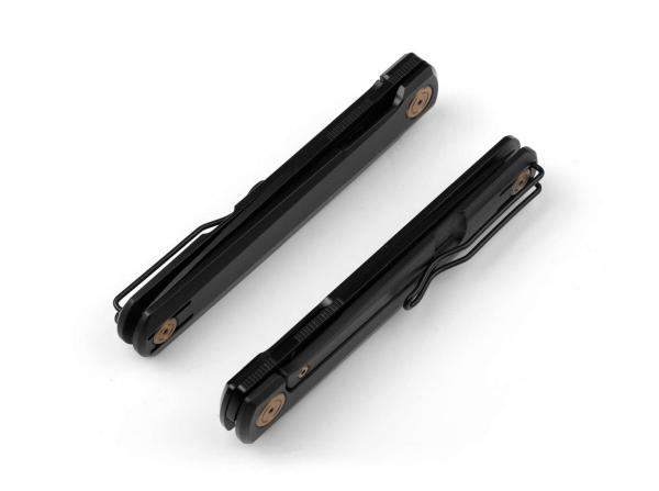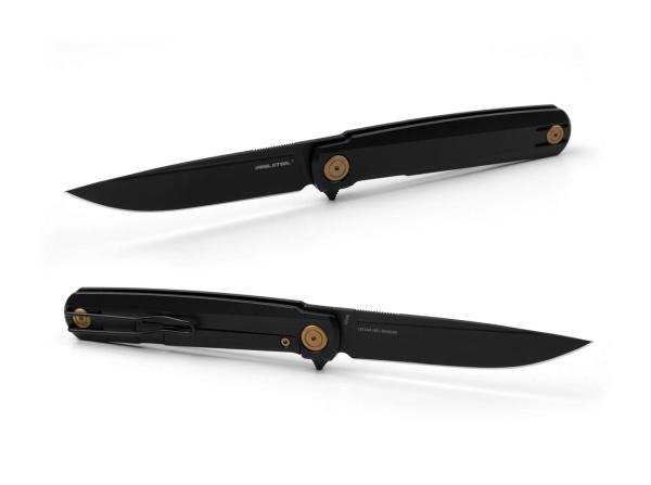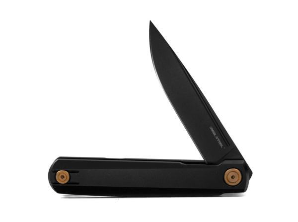 Real Steel G-Frame Titanium Black Gold preklopni nož dizajnirao je Ostap Hel, a odlično spaja dizajn u upotrebljivost. Kočnica je framelock tipa, drška je izu titana, a sječivo iz odličnog N690 čelika. Real Steel G-Frame Titanium Black Gold preklopni nož je opremljen kvačicom za džep koju je moguće postaviti s lijeve ili desne strane noža.