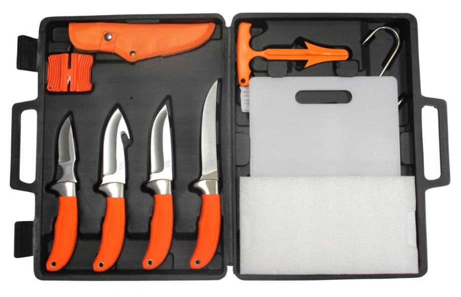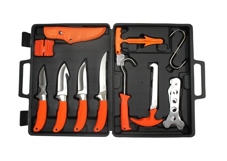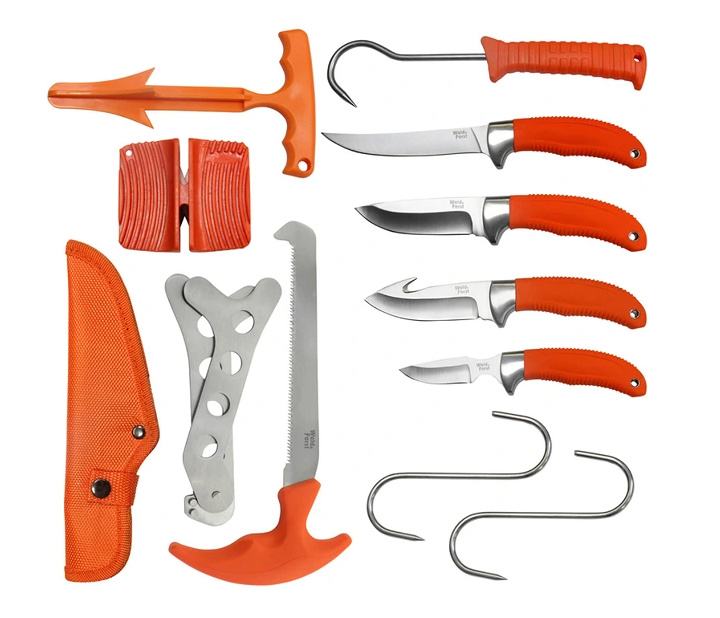 13-dijelni set Wald & Forst Big Box neophodan je za profesionalno rezanje mesa divljači - najvažniji pribor za obradu mesa divljači uvijek je pri ruci u ovom pregledno posloženom kovčegu. Oštrice noževa i pila za rušenje izrađeni su od nehrđajućeg čelika 420. Higijenske plastične ručke s TPR premazom ugodne su za držanje i mogu se sigurno koristiti čak i mokrim rukama. Ručke su opremljene rupama za uže koje omogućuju pričvršćivanje užeta. Najlonske navlake s kopčom uključene u set prikladne su za lovački nož, nož za deranje i otkoštavanje.