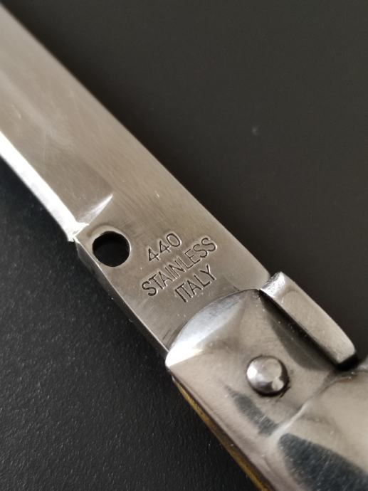 Nije kineska kopija kao večina istoimenih noževa. Na oštrici utisnuto "440 Stainless Italy" što označava vrstu čelika i mjesto proizvodnje noža.