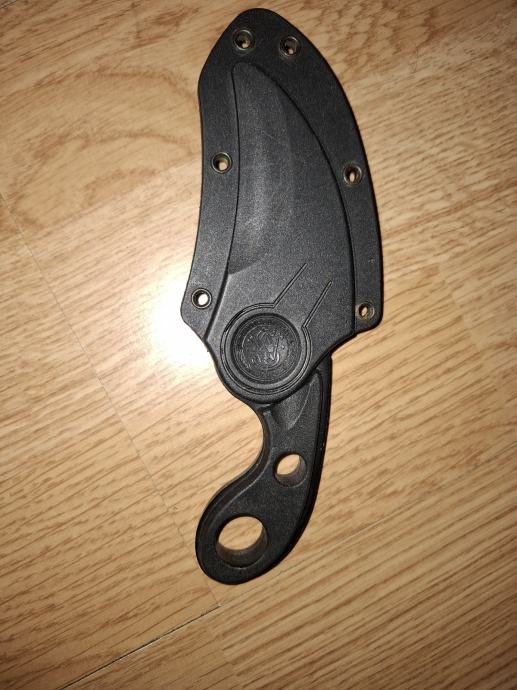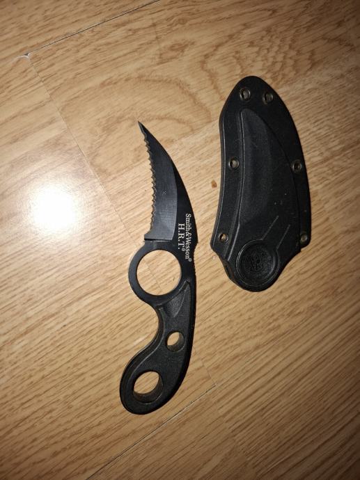 Prodajem Smith & Wesson HRT Bear Claw nož, kompaktan nož karakteristične zakrivljene oštrice s nazubljenim rubom i crnim premazom. Ručka je integrirana s prstenom za čvrst i siguran hvat. Dolazi s originalnom crnom plastičnom futrolom koja ima sustav za pričvršćivanje na pojas