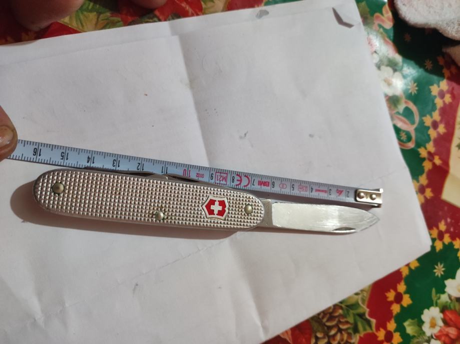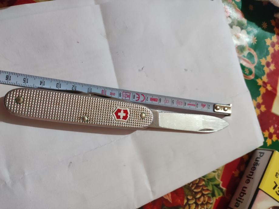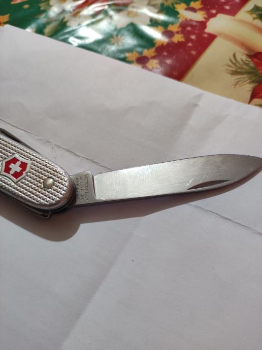 Victorinox višenamjenski džepni nož s aluminijskom drškama u srebrnoj boji. Malo je koristen, opremljen je s nekoliko funkcija - glavna oštrica, manja oštrica, otvarač za boce i dodatni alat. praktičan za nošenje. Funkcionalnost svih alata je očuvana i ostra nozic je i 1990g