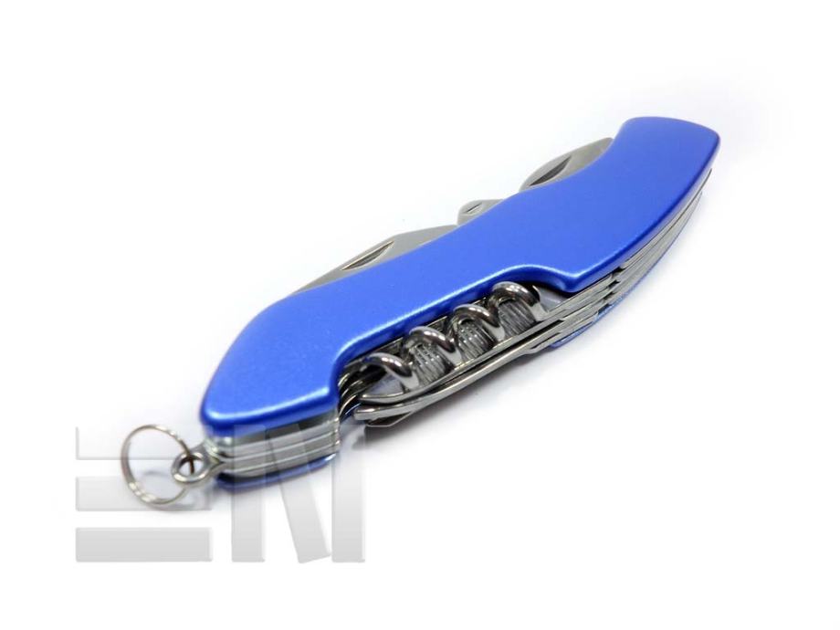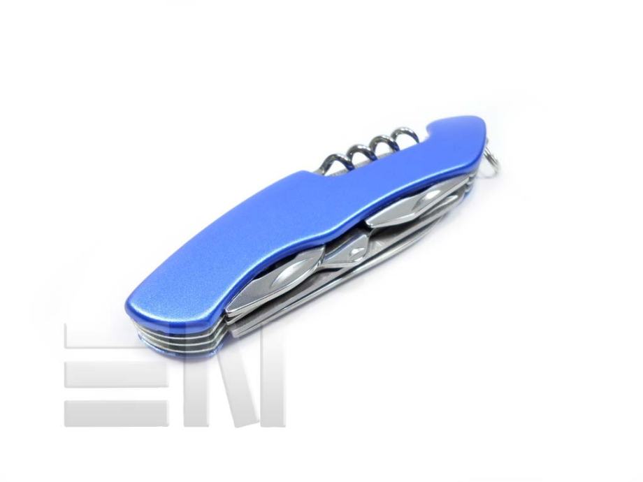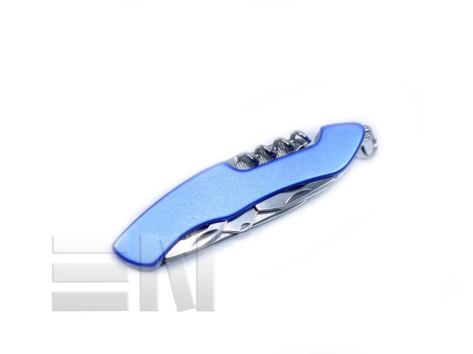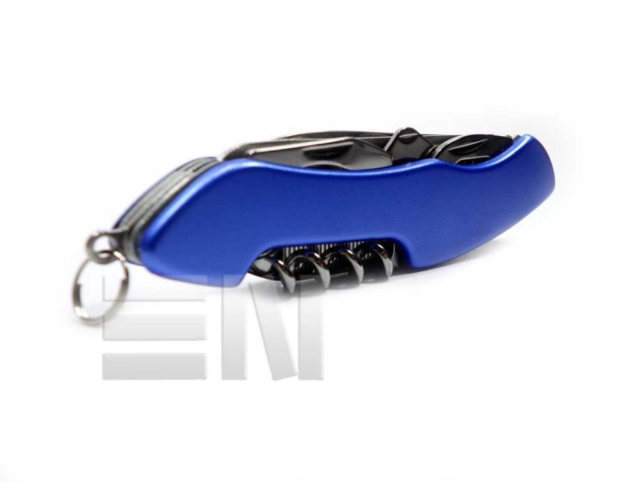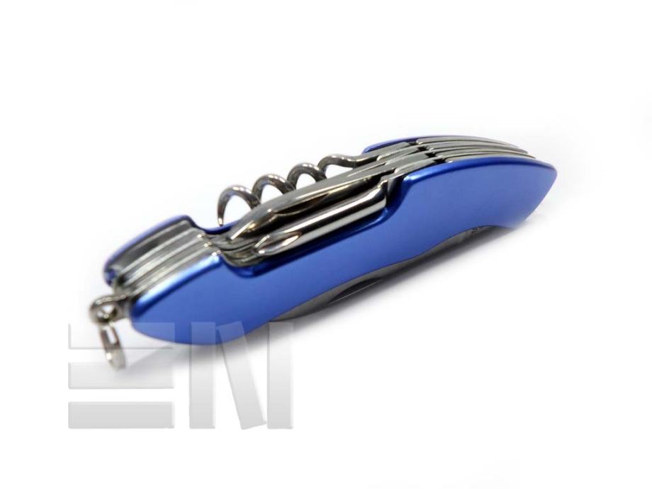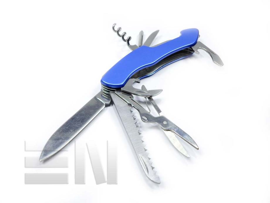 Višenamjenski kamping nož BLUE s 9 funkcija: nož, škarice, pila, otvarač konzervi, odvijač križni, otvarač metalnih čepova flaša, špica, otvarač plutanih čepova, dimenzija: zatvoreni 10 cm, rasklopljeni nož 16 cm, oštrica noža 6 cm, materijal izrade nehrđajući čelik korice noža aluminij u boji, odličan i neophodan alat za boravak u prirodi. Dostupan samo u plavoj boji.