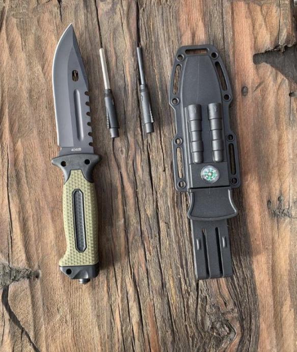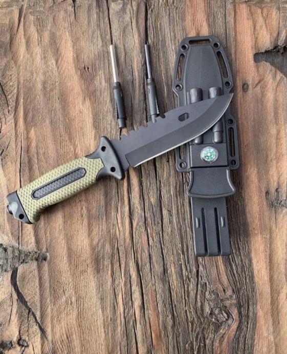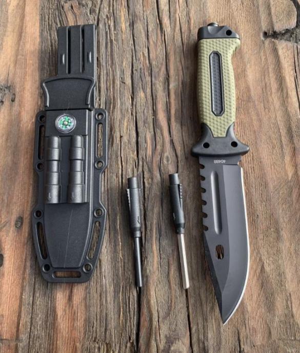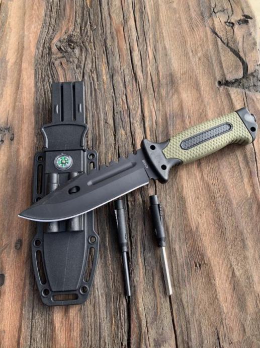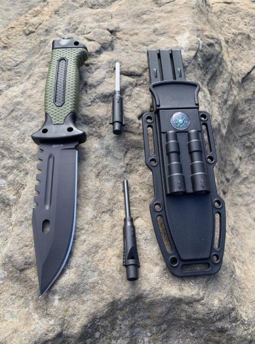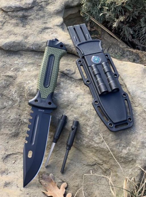 Vojno lovački nož za preživljavanje BGOK4048 praktičan, svestrani višenamjenski survival nož s oštricom od nehrđajućeg čelika nezaobilazan je za sve aktivnosti u prirodi, kampiranju, kampiranju, u planini ili na moru. Odličan izbor za kampere, izviđače i sve one koji vode aktivan stil života. Svestrana oštrica reže žicu, meso, drvo i razne druge materijale, a drška je ergonomski dizajnirana za bolji zahvat i veću udobnost. Nož dolazi u ABS futroli sa 5 pribora za hitne slučajeve: zviždaljku, oštrilo, razbijač stakla, kremeni upaljač i kompas