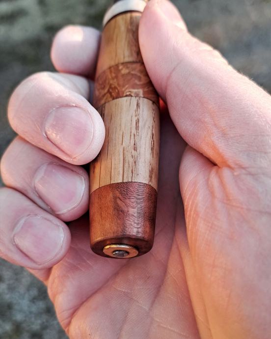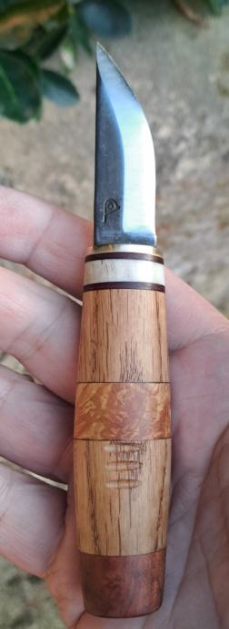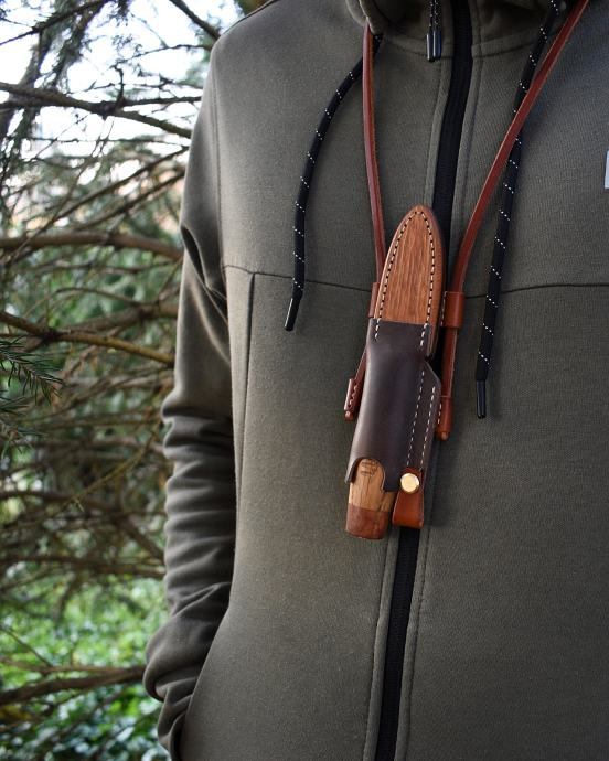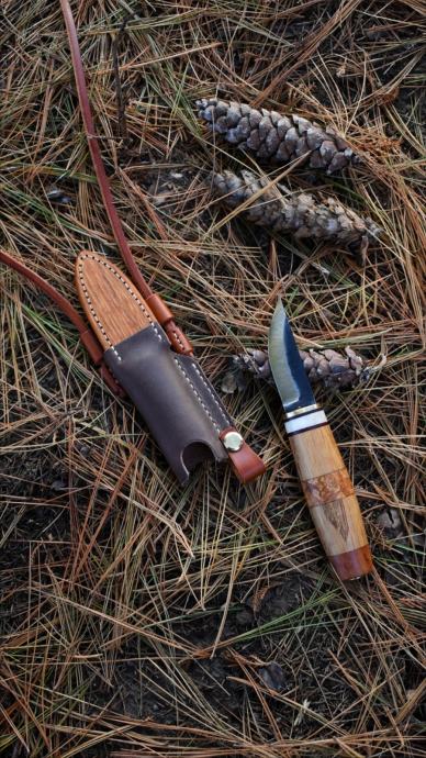 Ručka i futrola su napravljeni od više vrsta inpregriranog drveta,jelenskog roga, mesinga i kvalitetne kože.