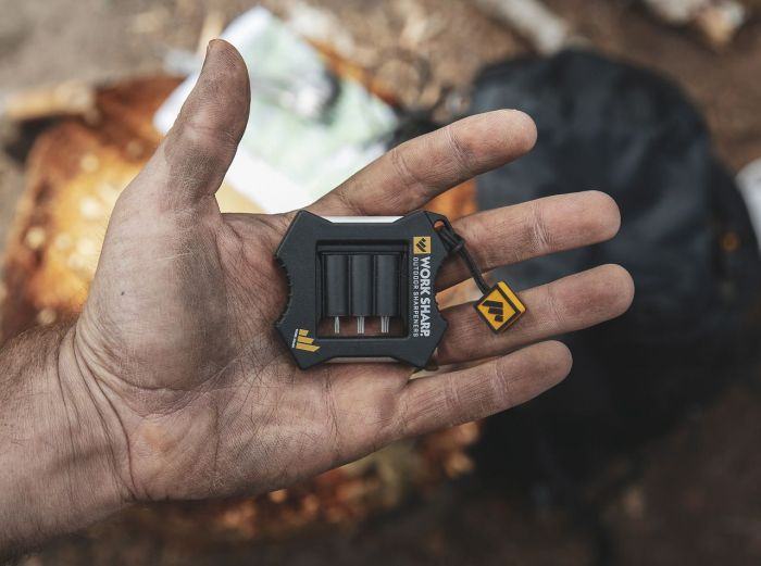 Work Sharp Micro Sharpener & Knife Tool je kompaktan i praktičan alat, koji sadrži i tri Torx nastavka, veličina T6, T8 i T10. Dijamantni štapić gradacija 600 oštri, a keramički fini brus služi za završno dooštravanje. Bočne vodilice podržavaju kut od 20° za dijamantni brus, a 25° za keramički. Zahvaljujući kompaktnim dimenzijama, ovaj se brus lako nosi u džepu ili alatu.