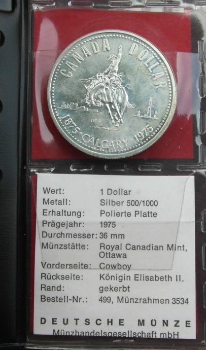 Kanadski novčić od 1 dolara iz 1975. s kaubojem je Calgary Centennial Silver Dollar, iskovan u čast 100. obljetnice osnutka Calgaryja, Alberte. Prikazuje rodeo kauboja na divljem broncu, s naftnim platformama i gradskom panoramom u pozadini na poleđini i kraljicu Elizabetu II. na licu, izrađen od 50% srebra i težine 23,3 grama te promjera 36 mm.