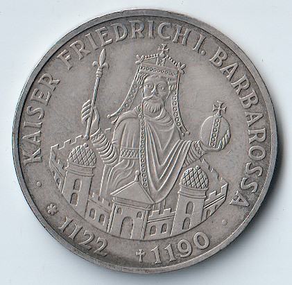 U ponudi srebrna njemačka prigodna kovanica od 10 Deutsche Mark iz 1990. godine, izdana u čast cara Friedricha I. Barbarosse (1122–1190).