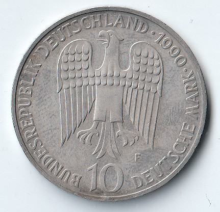 Revers nosi saveznog njemačkog orla i natpis BUNDESREPUBLIK DEUTSCHLAND 1990 10 DEUTSCHE MARK.