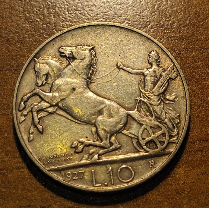 TipStandardni optjecajni novčićGodine1926-1934Vrijednost10 lira (10 ITL)ValutaLira ( 1861.-2001 .)SastavSrebro (.835)Težina10 g.Promjer27 mm.Debljina2,20 mm